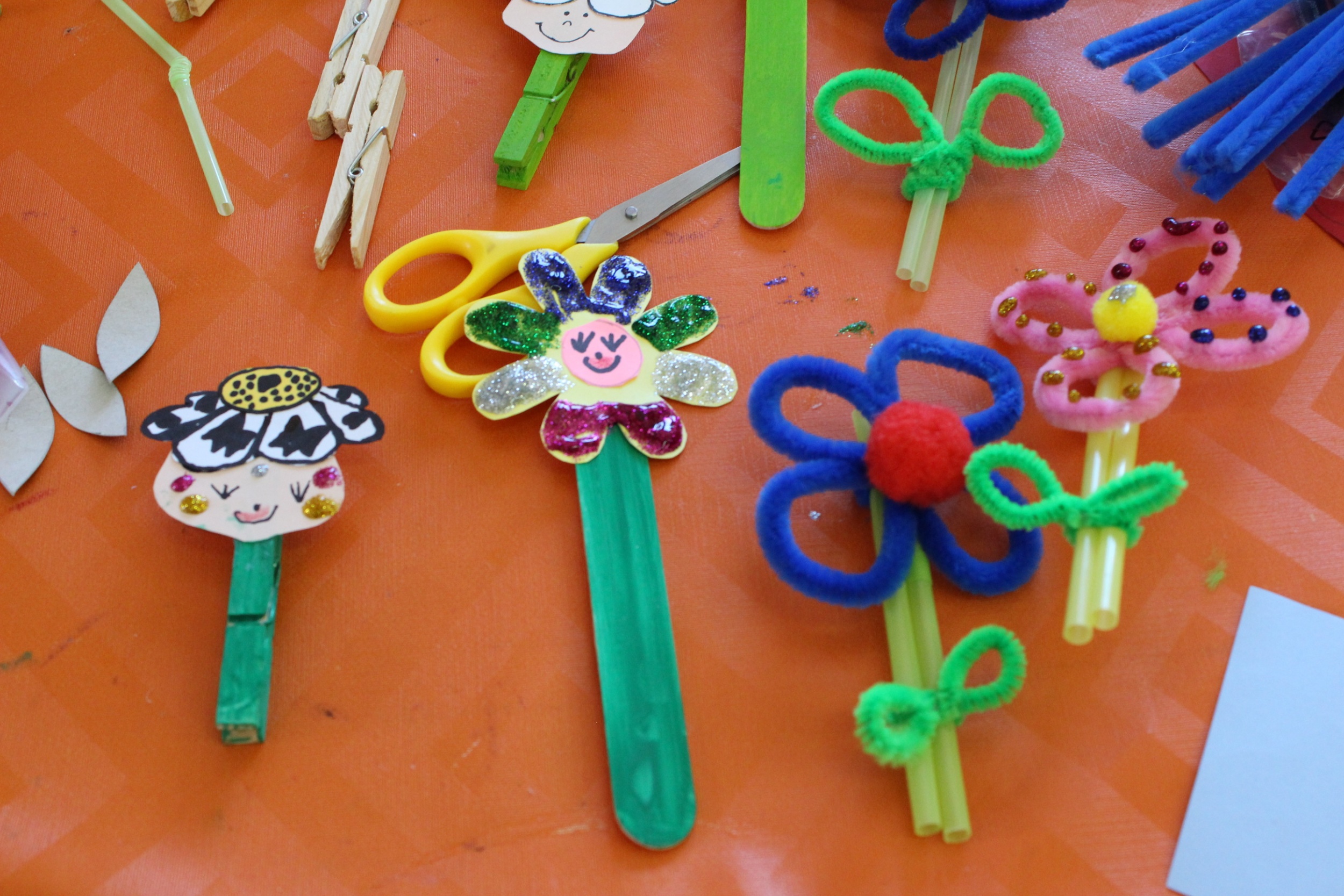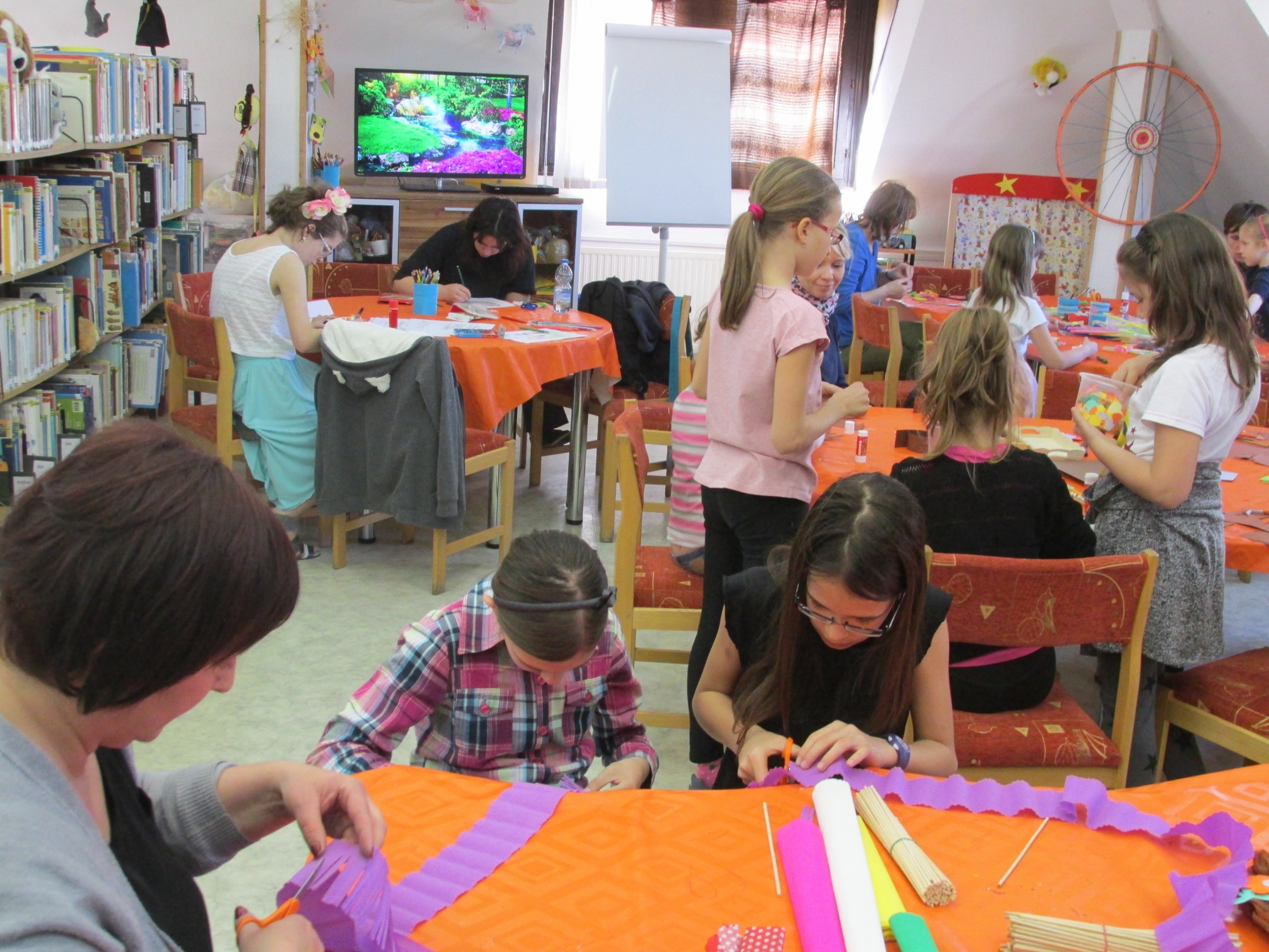 Az áprilisi összejövetelen a tavaszi virágok volt a téma. A résztvevők megtapasztalhatták, hogy krepp papír, egyszerű háztartási csipesz, szívószál felhasználásával milyen szép lakásdíszt, vagy dekorációt lehet készíteni.
